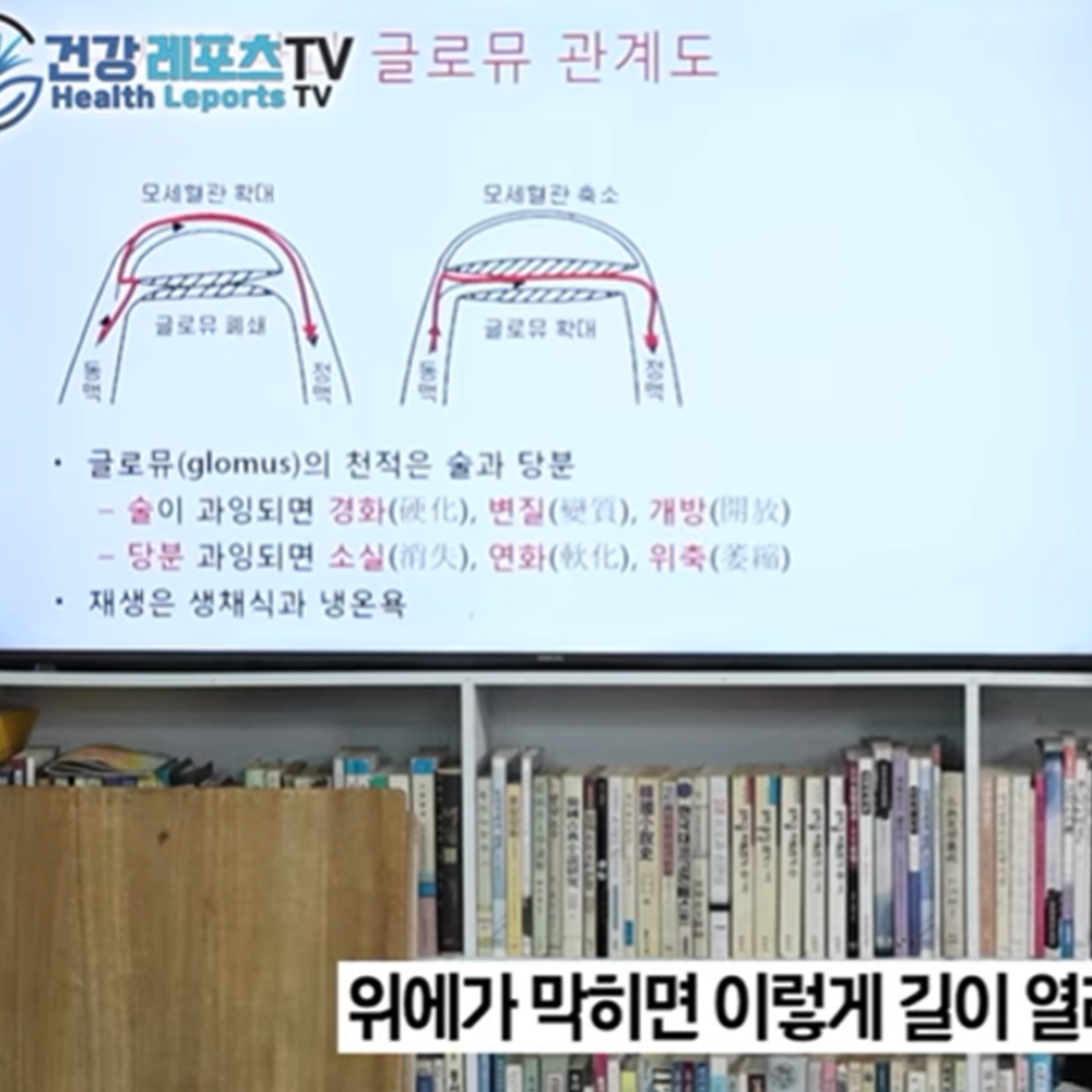 혈관이 좁아져서 막히게 되면 글로뮤가 생성되어 혈액의 흐름이 원활하게 해야 한다. 글로뮤는 샛길을 살려두는 것이다. 글로뮤는 우리가 섭취하는 알코올, 당류로 사라지게 된다. 식습관에도 주의를 기울여야 한다.