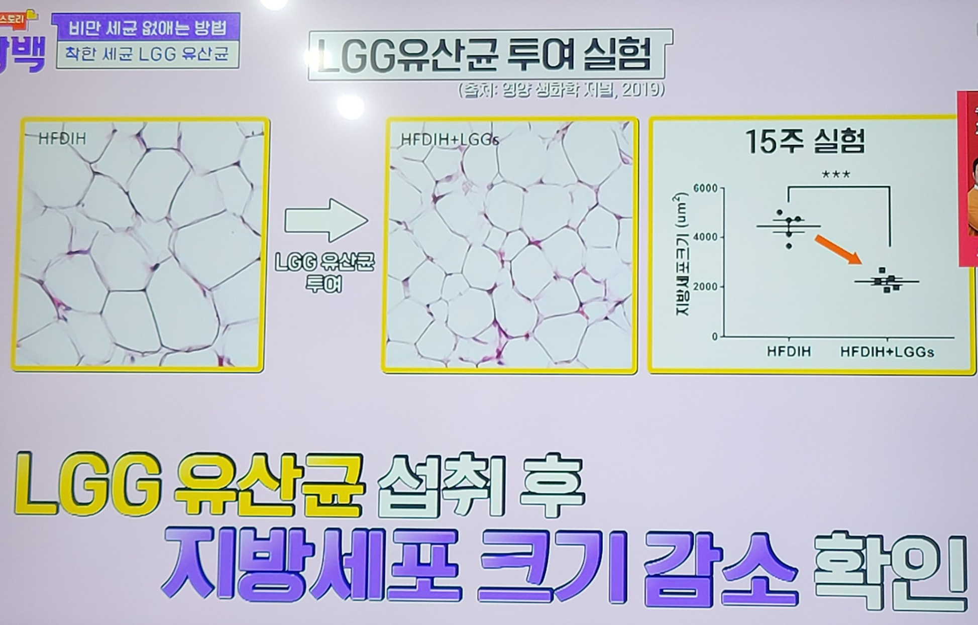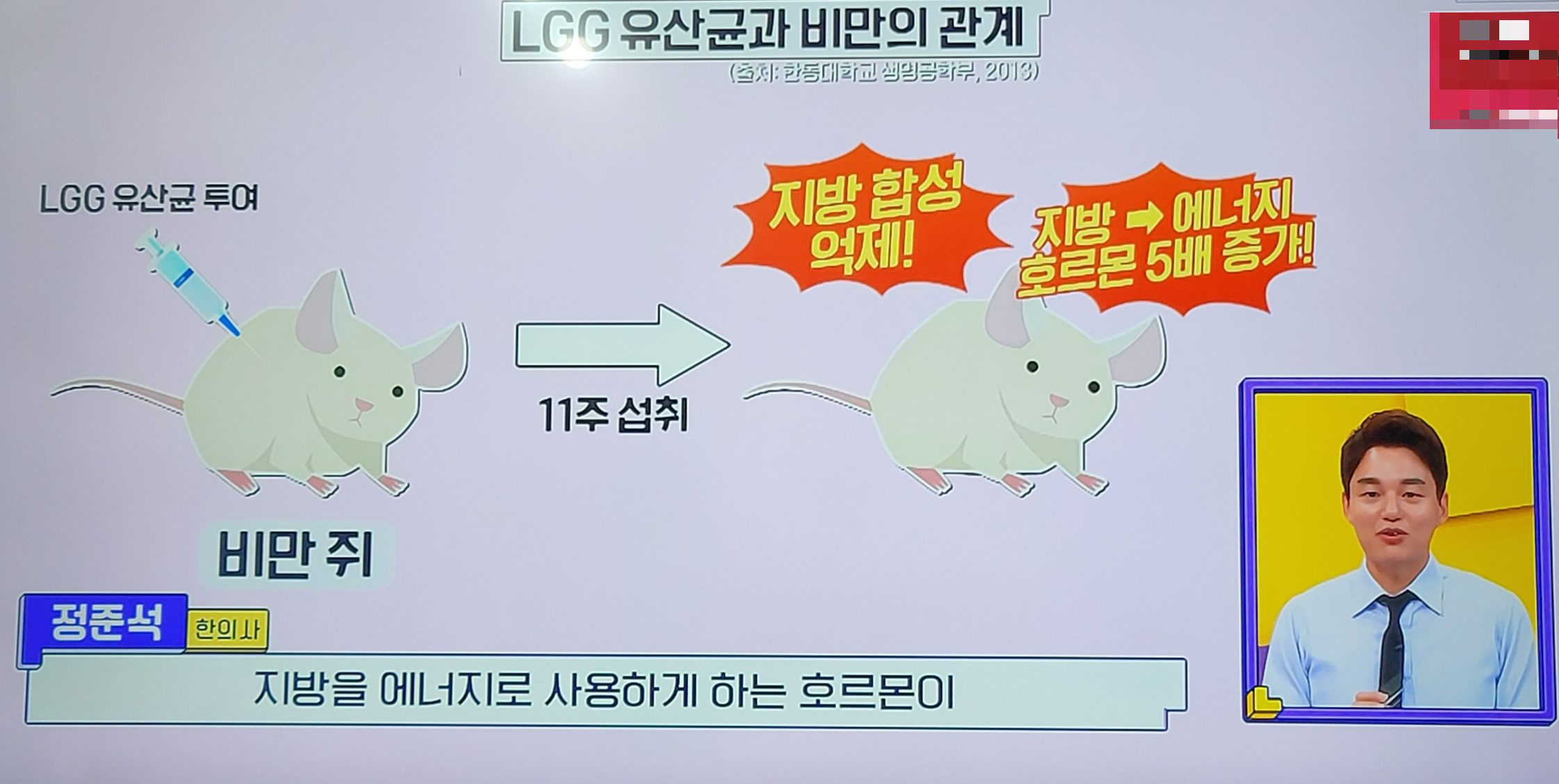 또한 지방합성 억제 실험을 위해 비만 쥐에게 LGG 유산균을 11주 섭취시켰더니 지방합성 억제와 지방을 에너지로 사용하게 하는 호르몬이 5배 증가하였다고 한다. (출처 : 한동대학교 생명공학부, 2013)